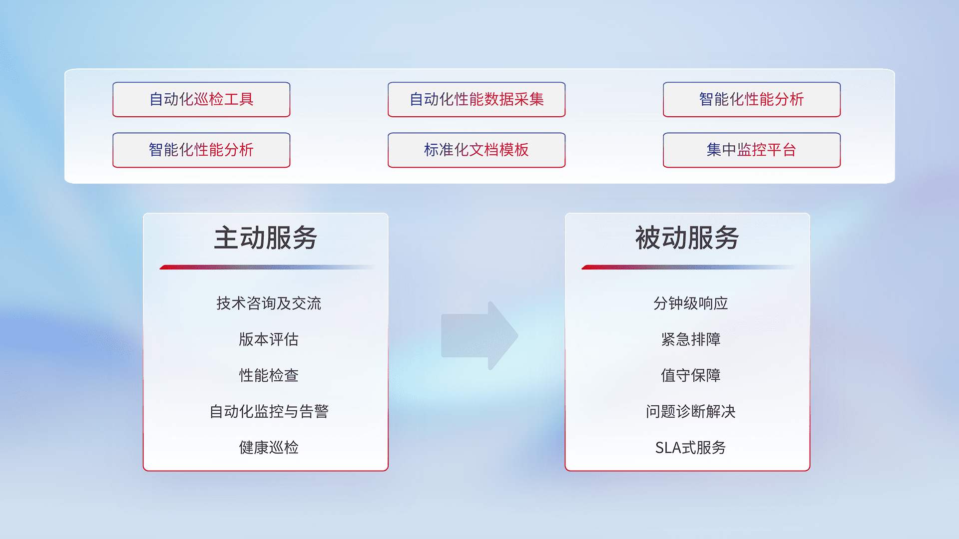 智能化工具和标准化文档,,保障服务质量,,,提供主动服务(包含技术咨询、、版本评估、、性能检查、、自动化监控与告警、、、健康巡检)和被动服务包含(分钟级响应、、紧急排障、、值守保障、、、问题诊断解决、、、、SLA服务)。。